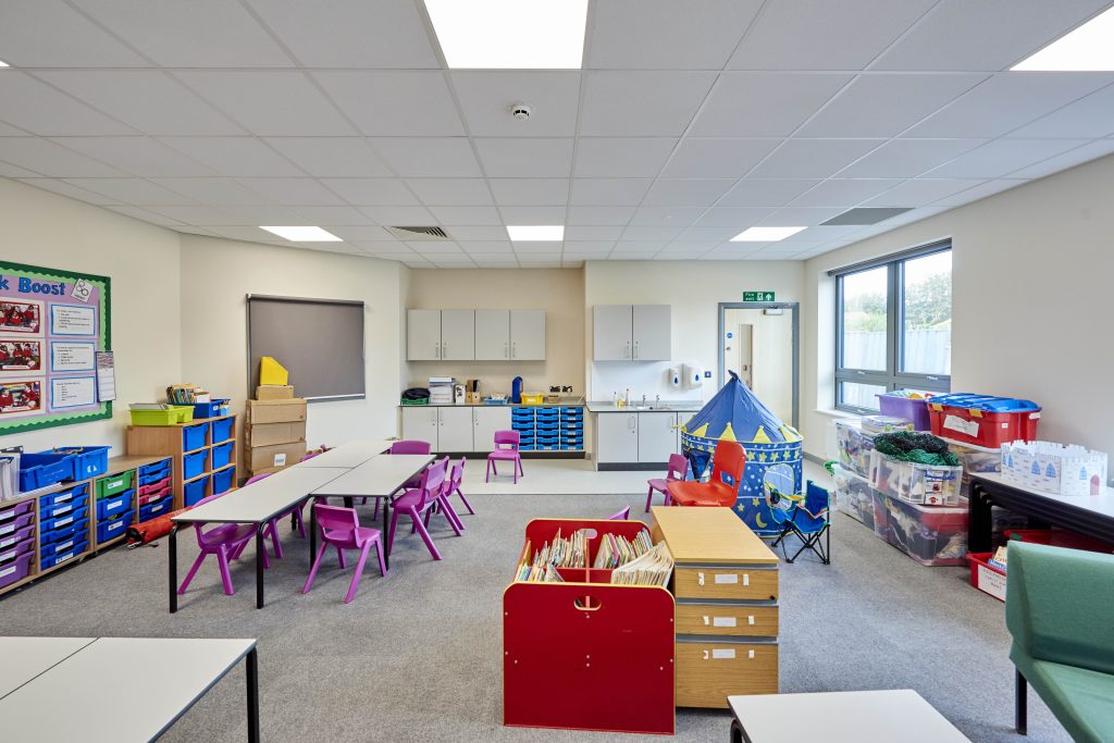 The new two-storey, 2,196m² building includes 124m² of nursery provision for 30 children and integrates temporary accommodation solutions, phased demolition, and site constraints seamlessly. All teaching facilities were successfully transferred into the new school, with final works completed on time. The PV system and carefully designed external lighting demonstrate a commitment to sustainability and community sensitivity, delivering a modern, energy-efficient learning environment.